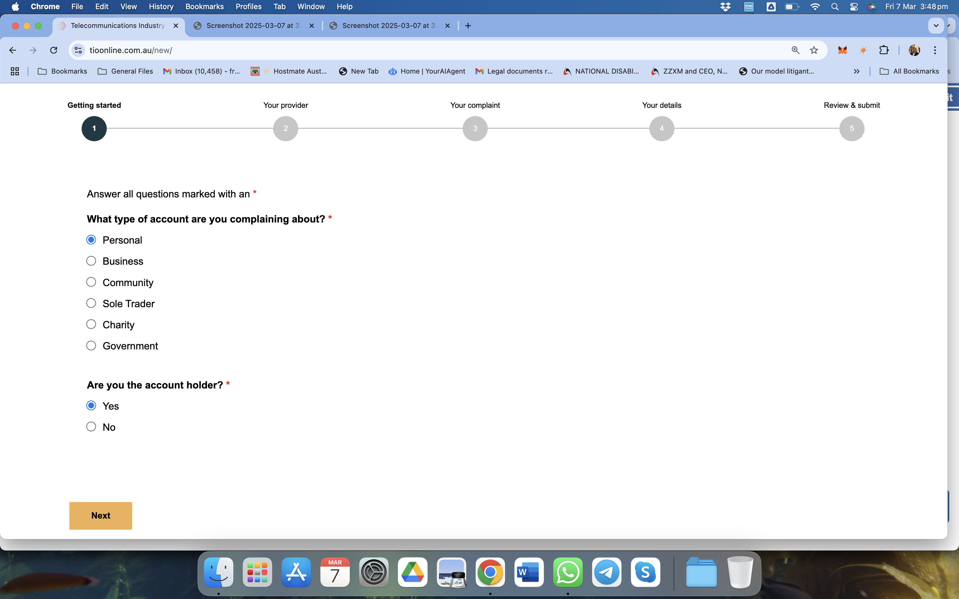 Select the correct type of account you are making the complaint under.