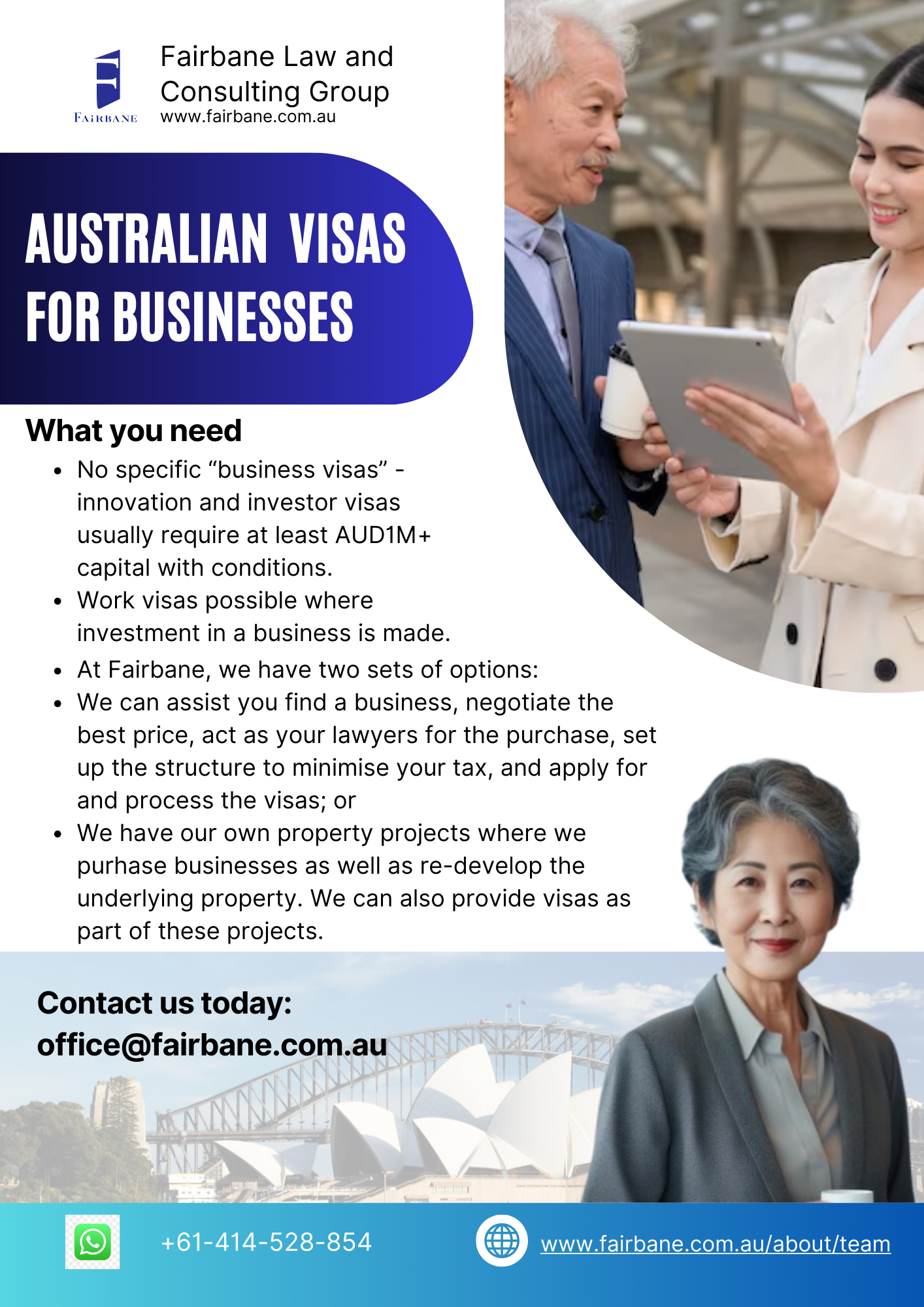 • Work (Businesses) Visas with structuring for business purchase and business application as well as employee application;